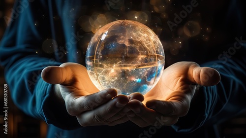 The hands of a businessman holding a world illuminated on its continents, Generative AI.
