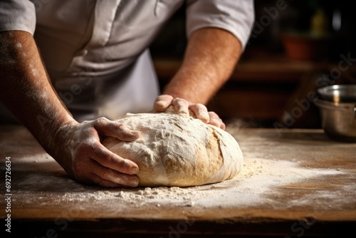 The hands of a male baker shaping bread from dough, a banner with space for your text