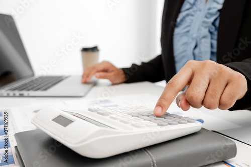 The hands of a male businesswoman use the calculator are analyzing and calculating the annual income and expenses in a financial graph that shows results To summarize balances overall in office