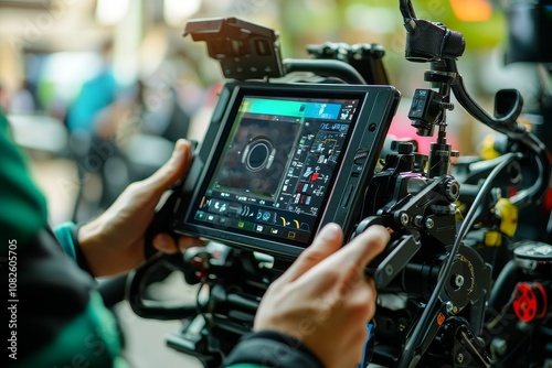 The hands of a photographer, a cameraman, and a person with stabilizing equipment in the studio during photography, production, and media. When shooting videos, documentaries, and films on set.