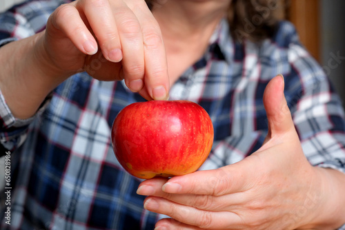 The hands of an elderly woman hold a red ripe tasty juicy apple