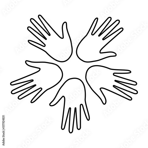 The hands of multiethnic people are arranged in a circle with a black outline on a white background. Coloring. Loving hands show support.