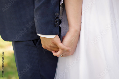 The hands of the bride and groom. Hands in the lock. The groom holds the hand of the bride tightly. Wedding day
