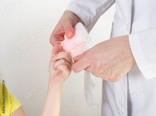 The hands of the doctor bandage the sore finger with a bandage of the child. Injury and wound on the finger in children, close-up
