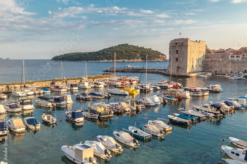 The hardbour of Dubrovnik at dusk time with a few clouds in the sky