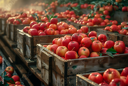 The harvested apple crop is neatly packed in wooden boxes on the sorting table, ready for distribution at a bustling orchard during the peak of the harvest season