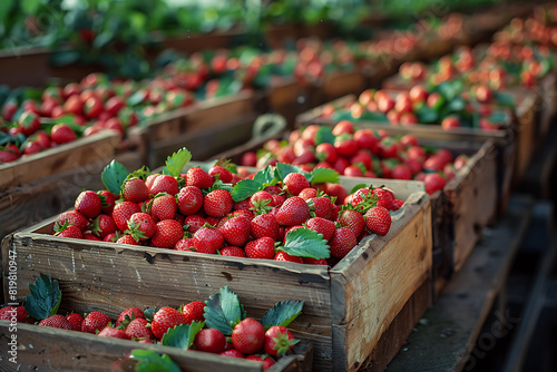 The harvested strawberries are neatly packed in wooden boxes on the sorting line, ready for distribution at a bustling farm during the peak of the harvest season