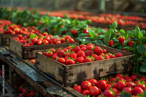 The harvested strawberries are neatly packed in wooden boxes on the sorting line, ready for distribution at a bustling farm during the peak of the harvest season
