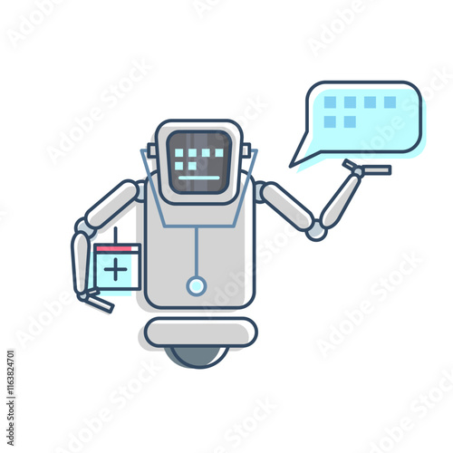 The healthcare assistant robot is equipped with a stethoscope, display, and interactive robotic hand, as well as holding a medical kit. demonstrating functionality in a healthcare environment