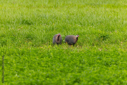 The helmeted guineafowl (Numida meleagris) is native African bird, often domesticated in Europe and America
