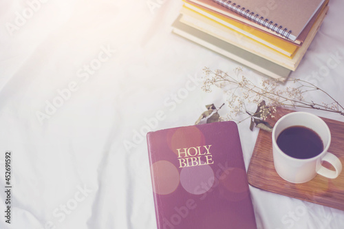 The Holy Bible and a cup of black coffee over blurred book stack on the bed, Christian background morning devotional concept with copy space