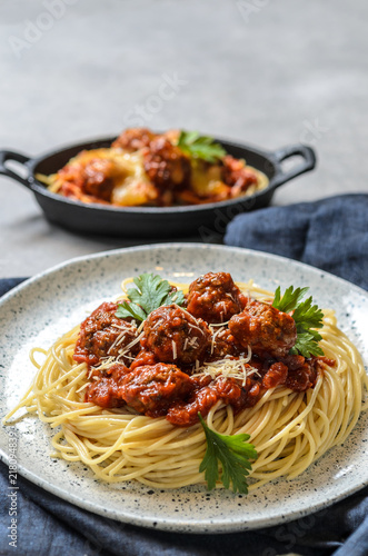 The homemade italian pasta or spaghetti with meatball , cheese and tomato sauce placed in a white dish with on dark blue tablecloth on the table..