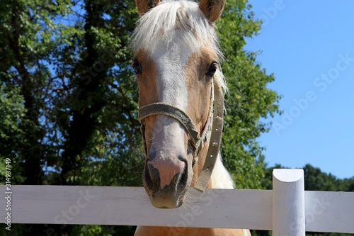 The horse stands behind the wooden fence. Curious look