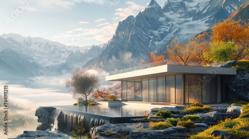 The house's modern architecture with glass walls overlooks a calm lake with stunning views of the forest and mountains, creating perfect harmony between contemporary design and nature.