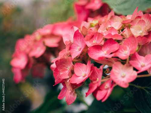 The hydrangea flower is red in close-up. Blooming, petals, selective focus