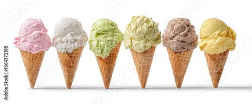 The Ice Cream Cones Lined Up Showing Six Colorful Scoops on White Background