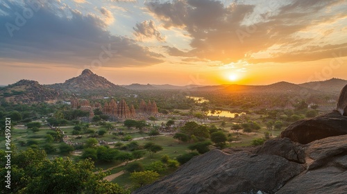 The iconic sunset view from the Hemakuta Hill in Hampi, overlooking the Virupaksha Temple.