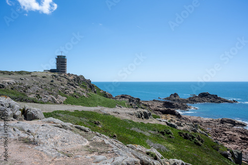 The iconic WW2 La Corbiere watchtower on the headland of St Brelade, Jersey, Channel Islands, British Isles.