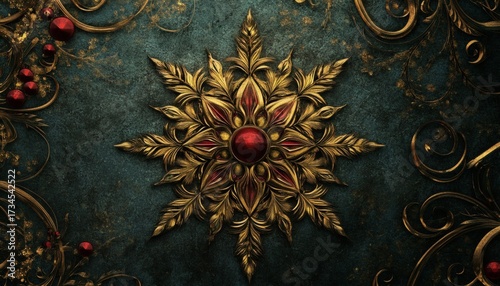 The illustration shows a detailed gold snowflake design with a central ruby gemstone, surrounded by swirling gold patterns on a dark teal background.