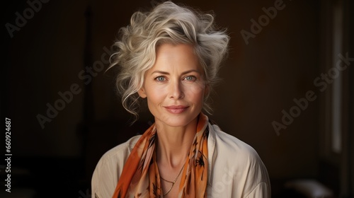 The illustration shows a portrait of a woman in beauty style, who radiates elegance and grace with flawless makeup and a trendy hairstyle. Generative Ai.