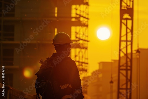 The image captures a hardworking construction worker on a site surrounded by cranes and buildings at sunset, showcasing diligence and modern urban development.