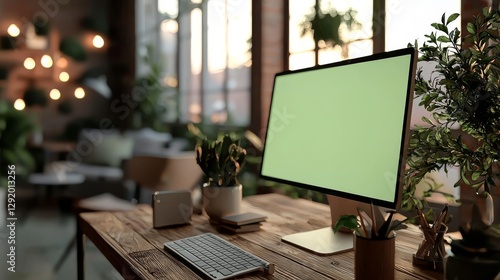 The image captures a professional freelancer working on a green screen personal computer from the comfort of his living room, with his hands typing and browsing the internet in an over-the-shoulder