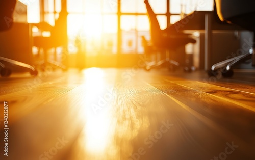The image captures a sunlit office space with warm light reflecting off the wooden floor and silhouetted chairs, creating a serene and inviting atmosphere.