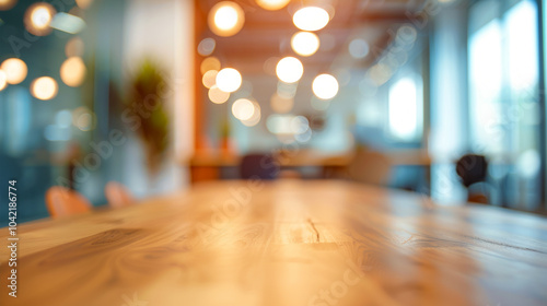 The image captures a warm and inviting workspace featuring a wooden table in the foreground, with soft bokeh lighting creating a serene ambiance throughout the area
