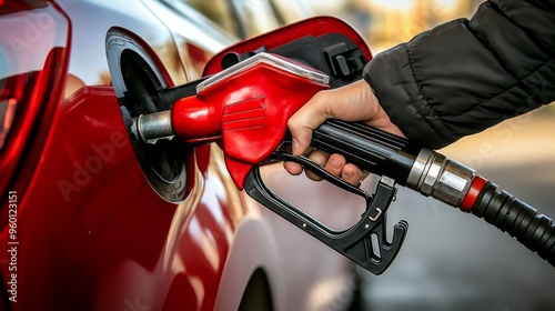 The image depicts a hand holding a red fuel nozzle, refueling a red car at a gas station, emphasizing the concept of refueling vehicles with gasoline for transportation.
