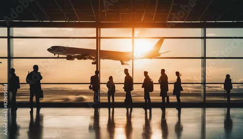The image depicts silhouettes of passengers waiting in front of a window at an airport and on an air