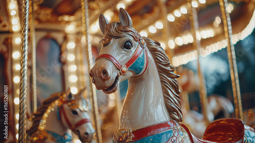 The image features a close-up of a colorful horse on a carousel, with the horse's mane and bridle in focus