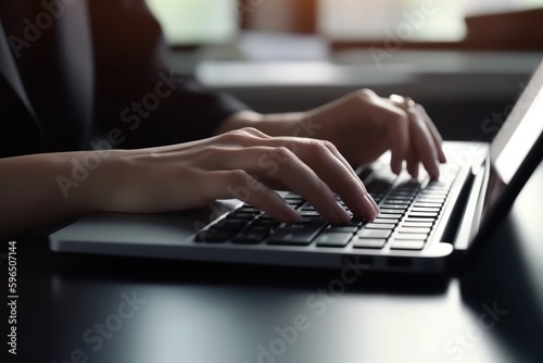 The image features a close-up view of a businesswoman's hand as she uses a laptop to perform financial calculations on her office desk.