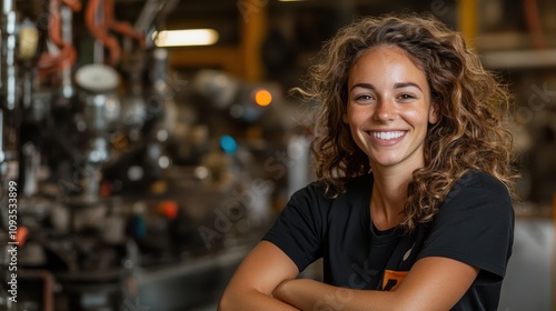 The image features a confident female engineer smiling with arms crossed in an industrial setup, surrounded by machinery, signifying expertise, dedication, and empowerment.