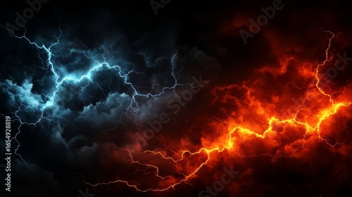 The image is a dark, stormy sky with two bolts of lightning striking the ground. The sky is filled with dark clouds and the lightning bolts are bright and powerful. Scene is intense and dramatic