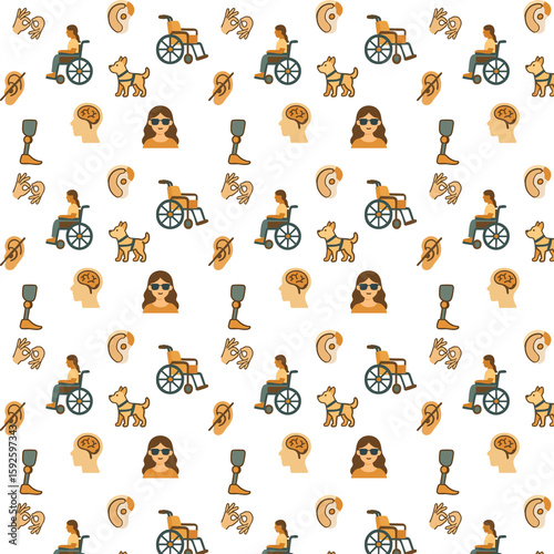 The image is a seamless pattern featuring various disability icons, including wheelchairs, guide dogs, prosthetic legs, hearing aids, sign language symbols, and individuals with visual or cognitive im