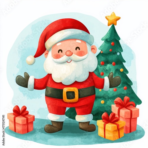 The image is a watercolor illustration of Santa Claus standing near a Christmas tree with gifts