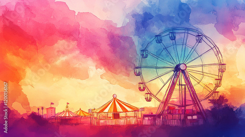 The image is an abstract, watercolor-style illustration of an amusement park at sunset