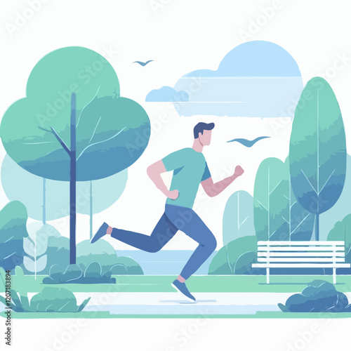 The image is an illustration of a man running in a park. The man is wearing a blue long-sleeved shirt and black pants. He is running on a road with trees and bushes on either side. In the background,