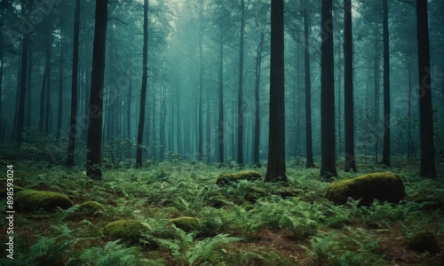 The image is of a dense forest with tall trees and a thick layer of green ferns covering the ground.