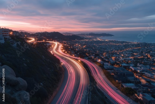The image showcases a stunning nighttime cityscape with a winding highway illuminated by car lights, capturing the energy and activity of the urban landscape under the twilight sky.