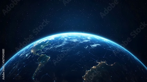 The image showcases a view of Earth from space, exhibiting the planet's curvature against the backdrop of a star-filled sky, with visible atmospheric blue glow.