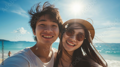 The image showcases a youthful Japanese couple posing for a selfie against a blurry background, capturing their playful and intimate connection.