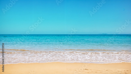 The image showcases serene beach scenes with golden sand, clear turquoise ocean waves, and a bright blue sky. Some images feature a straw hat on the sand, enhancing the relaxing summer atmosphere.
