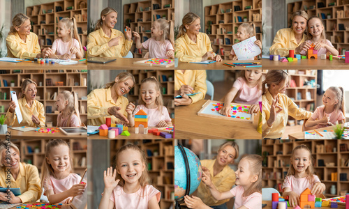 The image shows a collage of multiple scenes, showcasing young girls engaged in various learning activities with their teachers in a classroom setting.