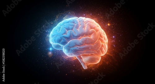 The image shows a glowing human brain, with one hemisphere in blue and the other in orange, set against a dark, cosmic background in this abstract illustration