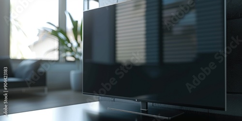 The image shows a modern living room with a sleek black and grey color scheme. A flat screen TV is mounted to the wall, enhancing the minimalistic design of the entertainment center.