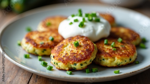 The image shows a plate of food on a wooden table. On the plate, there are four round, golden-brown patties arranged in a circular pattern.