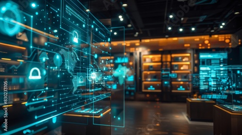 The image shows a retail store. There are shelves with various products. There are also digital displays that show information about the products.