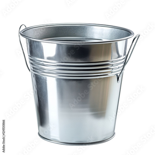 The image shows a small, empty, metallic bucket with two wire handles. Its silver surface is clean and reflective.