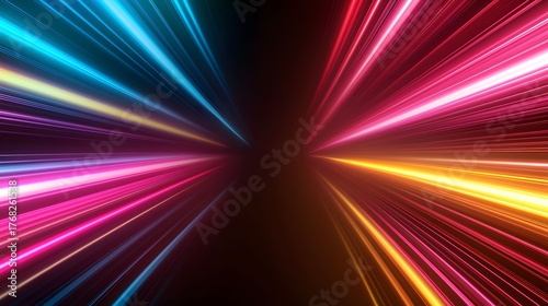 The image shows an abstract view of glowing, speeding light streaks in blue, pink, yellow and red towards a dark center, suggesting a sense of velocity and dynamic energy.
